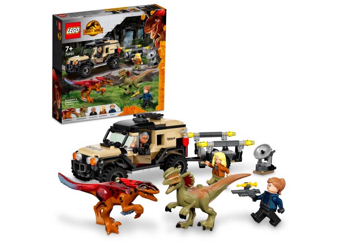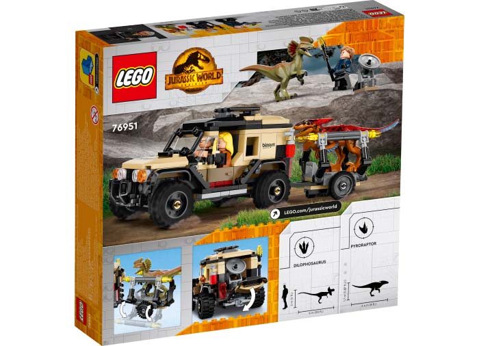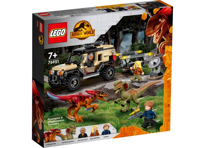 Data lansarii: 17 Aprilie 2022 Intră în rolul personajelor din filmul Jurassic World: Dominion, urmărind dinozauri cu acest set Transportul de Pyroraptor şi Dilophozaur (76951). Camioneta de teren are loc pentru 2 minifigurine, şi e echipată cu un detector de dinozauri detaşabil şi o remorcă detaşabilă cu o cuşcă pentru un dinozaur. Setul include şi 3 minifigurine LEGO - Ian Malcolm, Dr. Ellie Sattler şi un paznic cu o armă cu tranchilizant - plus figurine dinozauri Pyroraptor şi Dilophozaur.
