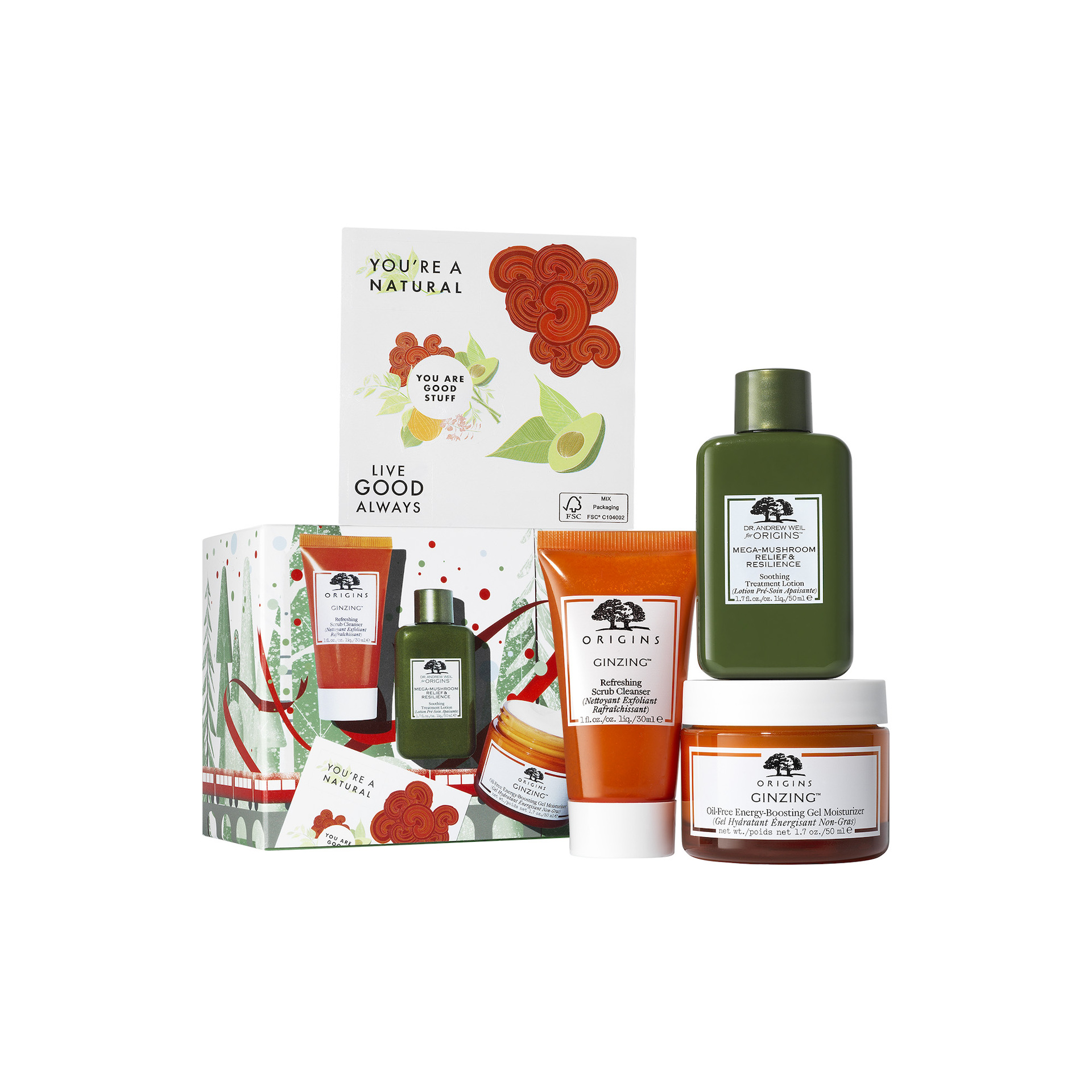 Origins Glow & Believe Ginzing, Femei, Set: Gel exfoliant de curatare Refreshing 30 ml + Lotiune calmanta Mega Mushroom 50 ml + Crema-gel hidratanta Ginzing 50 ml
