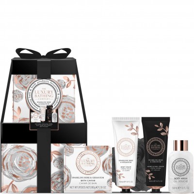 The Luxury Bathing Company Sparkling Rose & Geranium, Set: Crema de maini 50 ml + Crema de corp 50 ml + Gel de dus 50 ml + Caviar baie 80 gr + Burete de baie