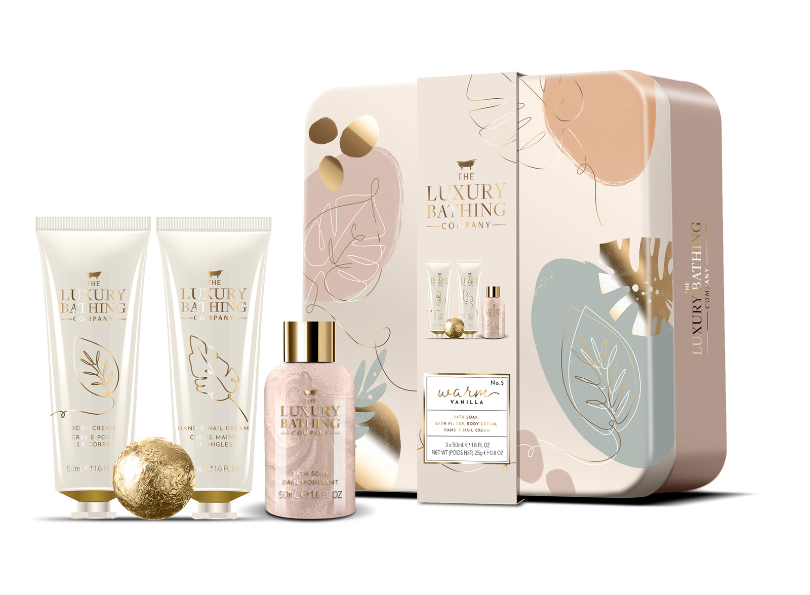 Warm Vanilla & Sweet Almond, Set: Crema de maini 50 ml + Crema de corp 50 ml + Spuma de baie 50 ml + Bomba baie 25 gr - The Luxury Bathing Company