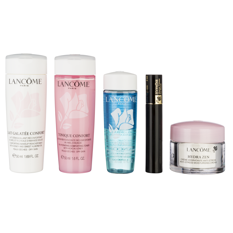 Travel Essentials, Femei, Set: Hydra Zen 15 ml + Tonique Confort 50 ml + Bi-Facil 30 ml + Galatee Confort 50 ml + Hypnose Mascara mini - Lancome